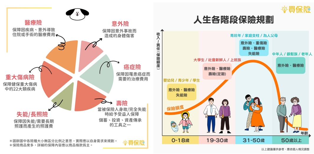 壽險、意外、醫療(實支&定額)、重大傷病、癌症(一次金&療程型)、失能/長照
