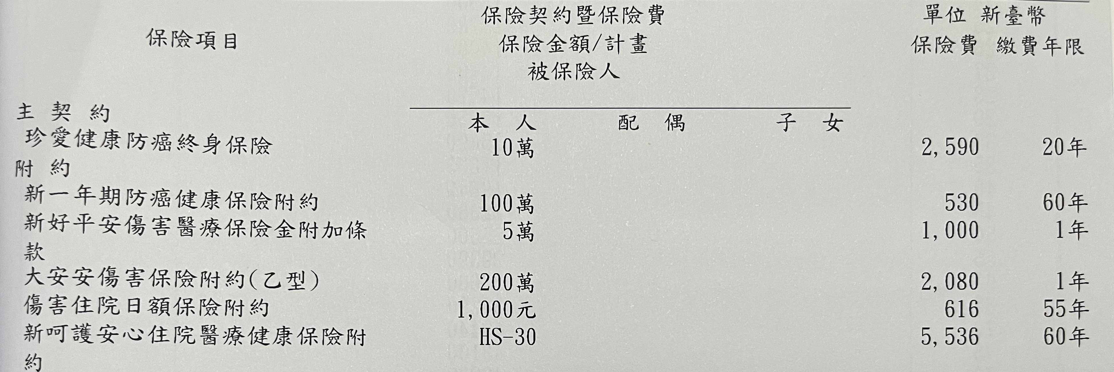 除了長照和壽險,其餘都有規劃到了~~