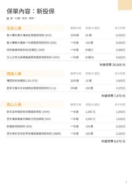 41歲 職等1 舊保單是早期父母請請人規劃,後面檢視保單時發現不太足夠,南山部分是業務本身待的公司,算是給他當業績,全球及遠雄部分是上網及跟業務討論結果,想詢問是否有可以調整的地方,其實試算保費時發現每年的保費有點高,正在檢討方案及保額調整,希望能給予指教,謝謝