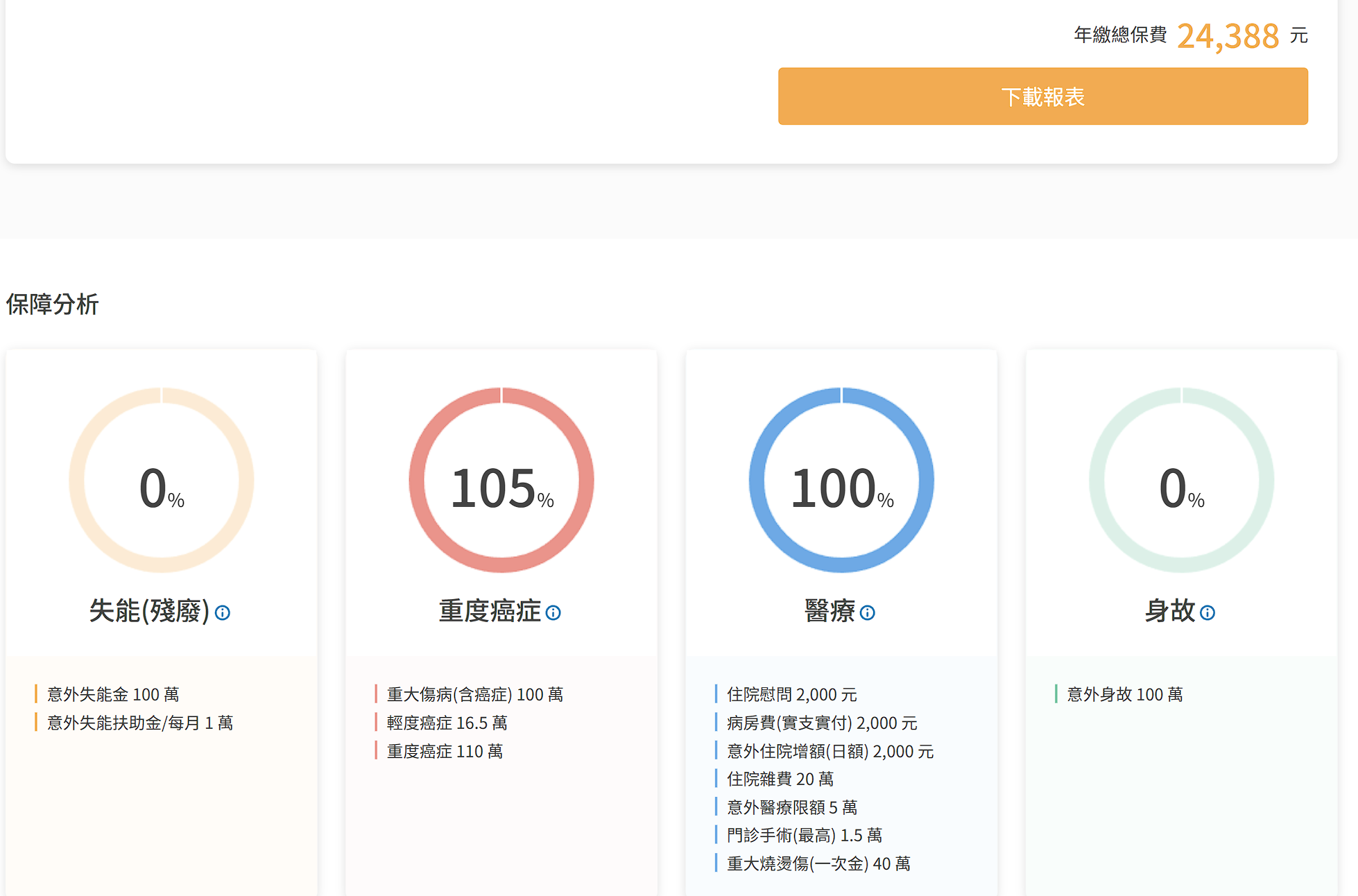 而底下搭配的是醫療實支與意外三寶基本保障。