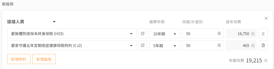 *癌症險: ① 節省主約成本,建議直接附加在補強保單的新光或全球