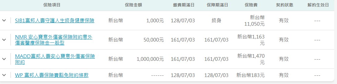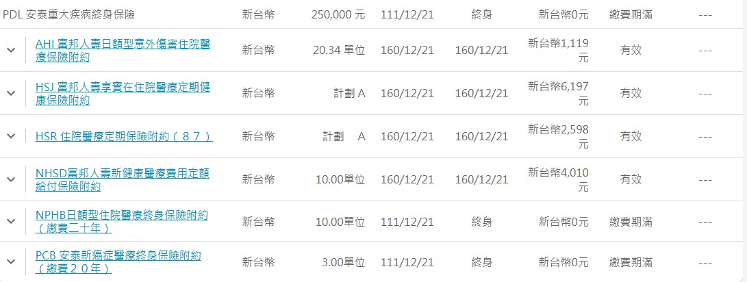 1.富邦:重大疾病、意外日額、實支實付、實支實付、住院日額/手術(定額)、癌症險(療程型)。