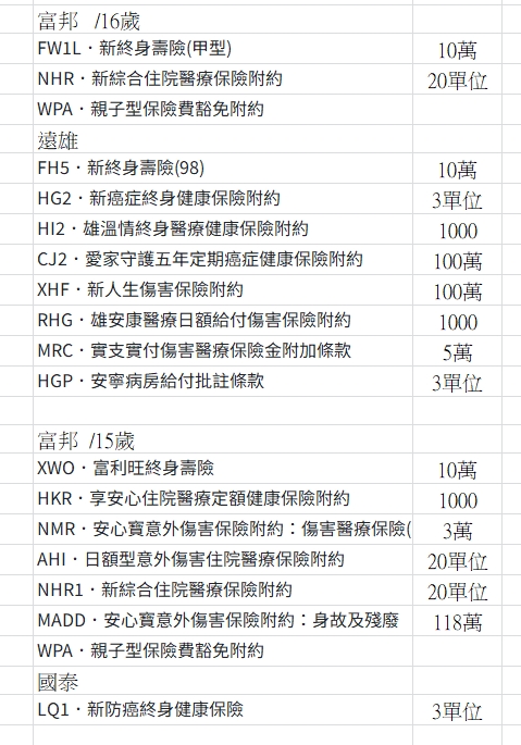2️⃣15歲:重大傷病、癌症一次金、第二家醫療實支實付/自負額(提高額度)及意外實支實付(提高額度)
