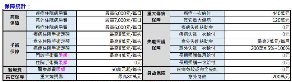 ⭕ 六大保障 : 醫療、癌症、重大傷病、失能(照護)、意外、壽險