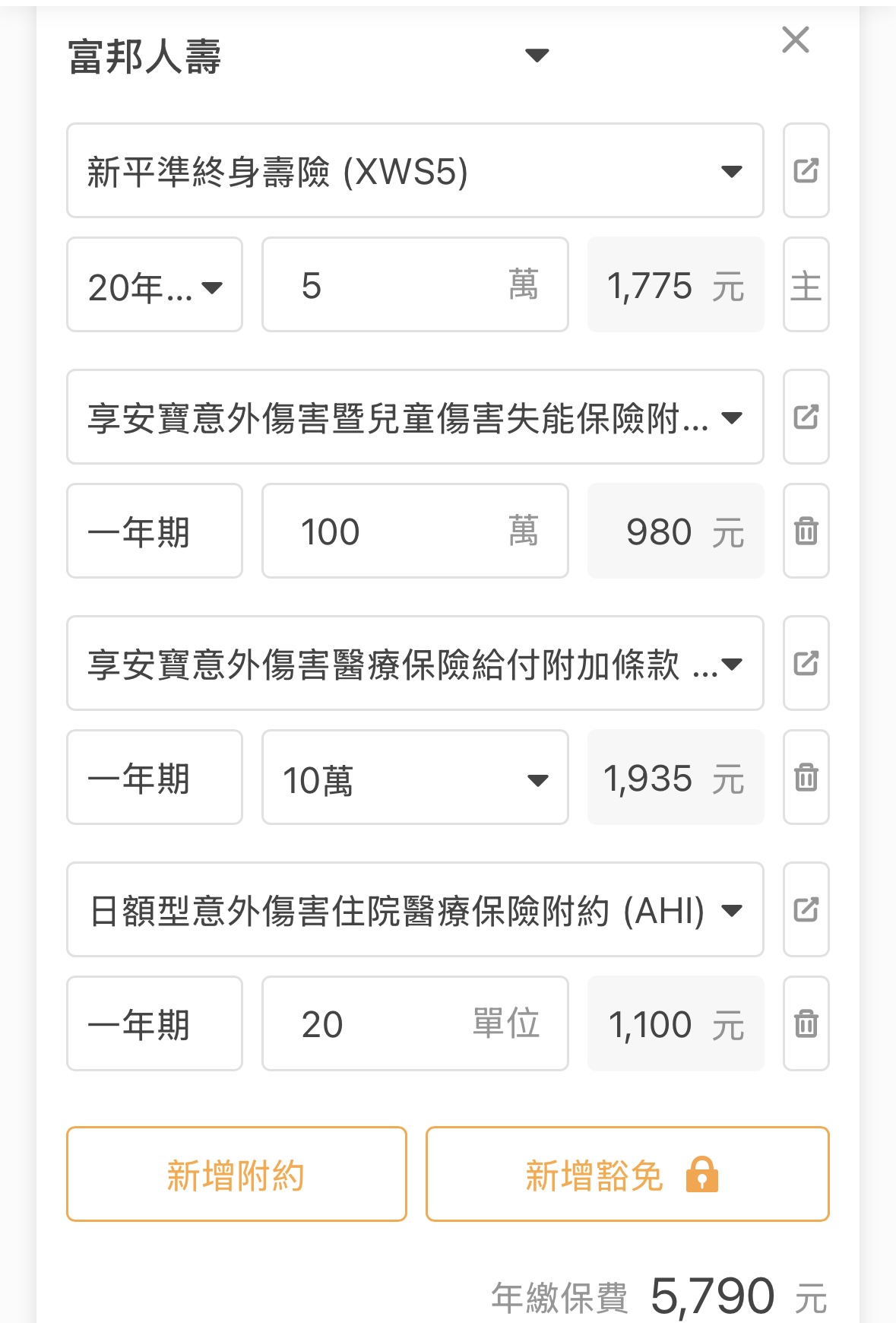 但富邦不符合投保規定,單純規劃意外險的終身壽險XWS5保額須規劃10萬,建議可以改成小額壽險OLA5 保額10萬出單