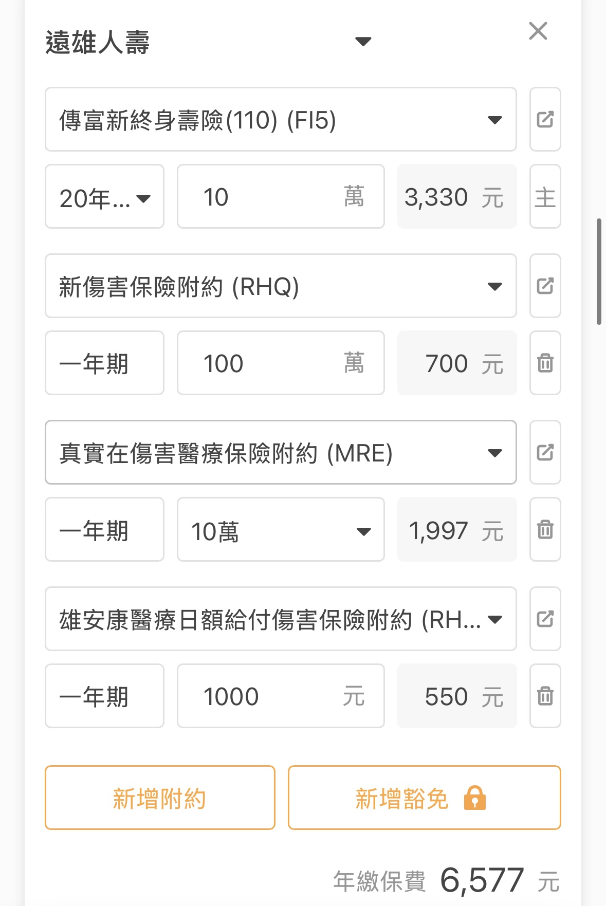 ⭕ 單純意外險的話 , 遠雄主約不會用終身壽險這選項 ,