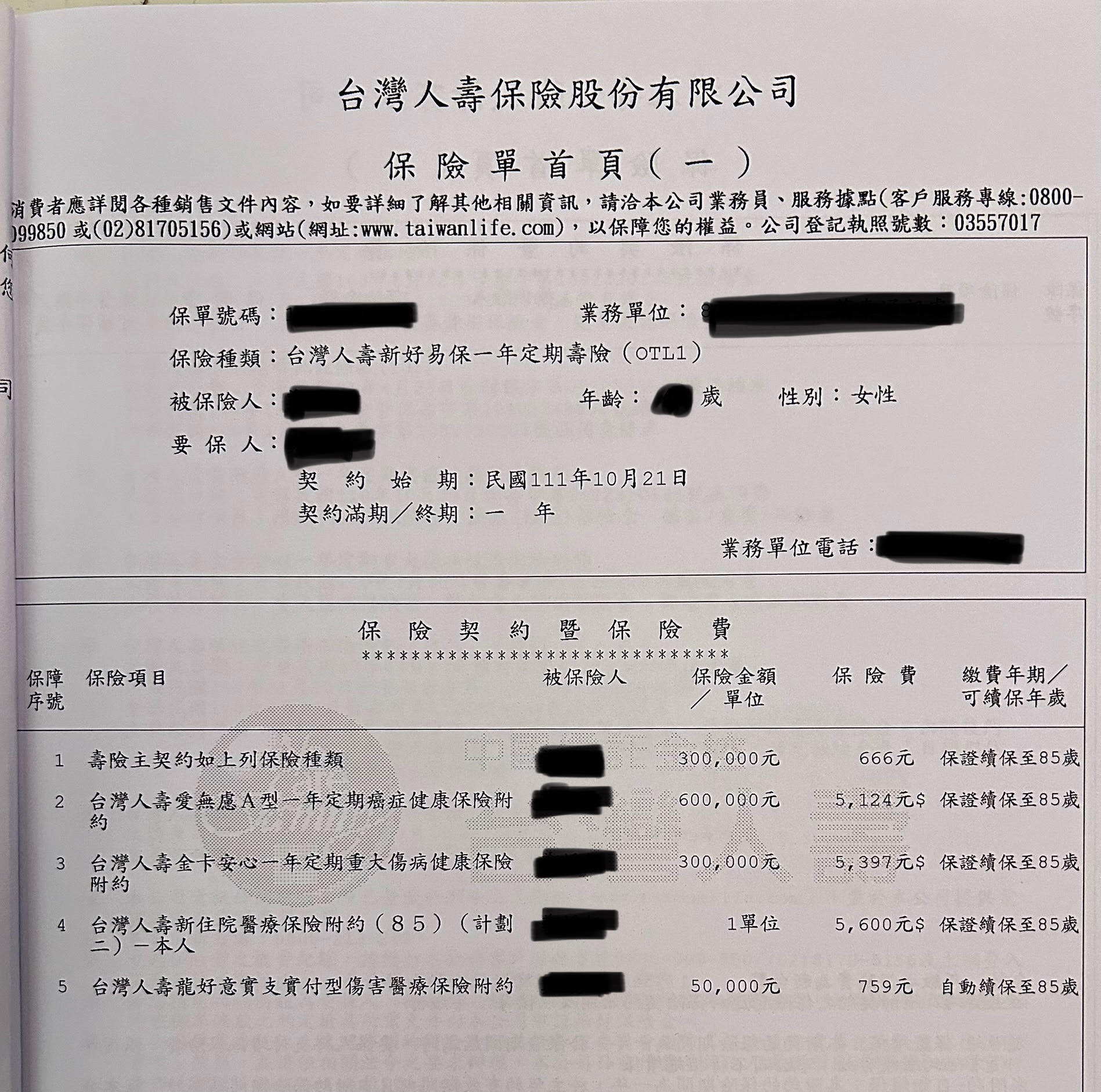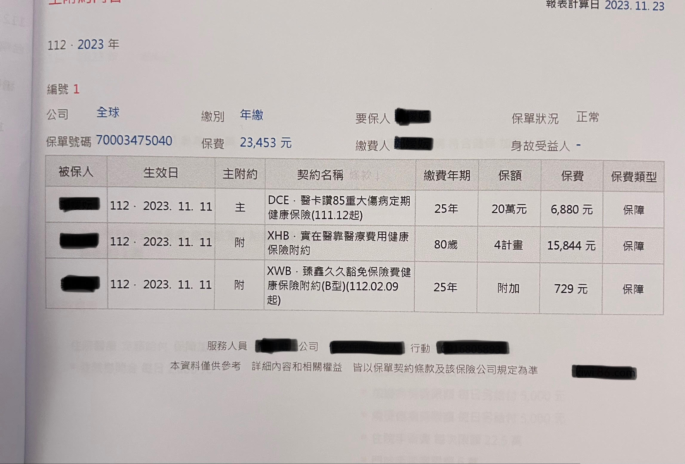⚠️補充說明,原先台壽的好易保定期壽險記得每年的保費都要按時繳,由於該定期壽險並未有保單價值準備金的部分,無法做自動墊繳動作,若未按時繳納,經催告仍未繳納保費,結果是整張主約連同附約會一併終止,不得不慎