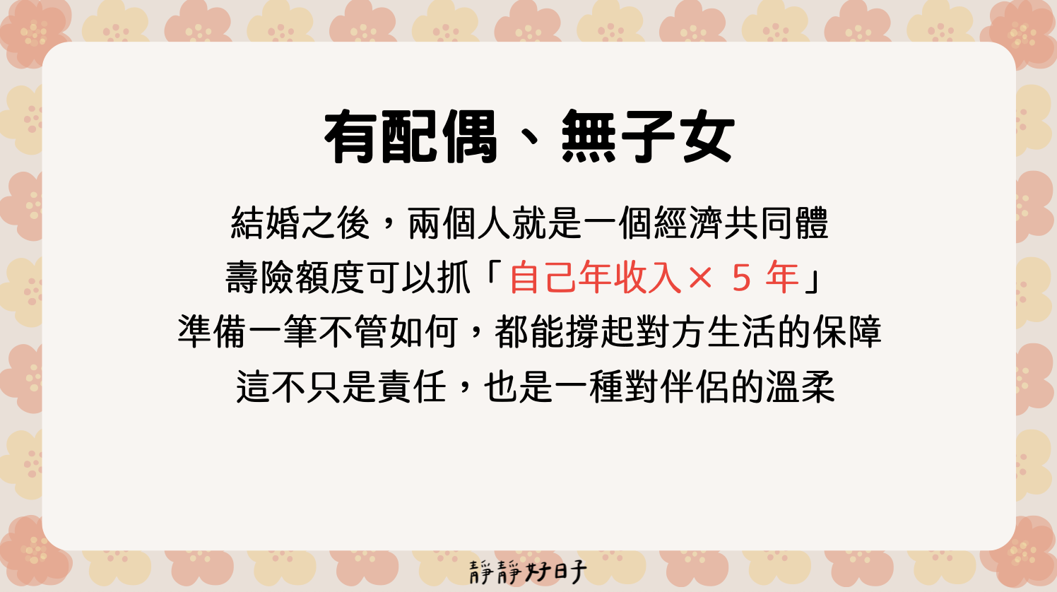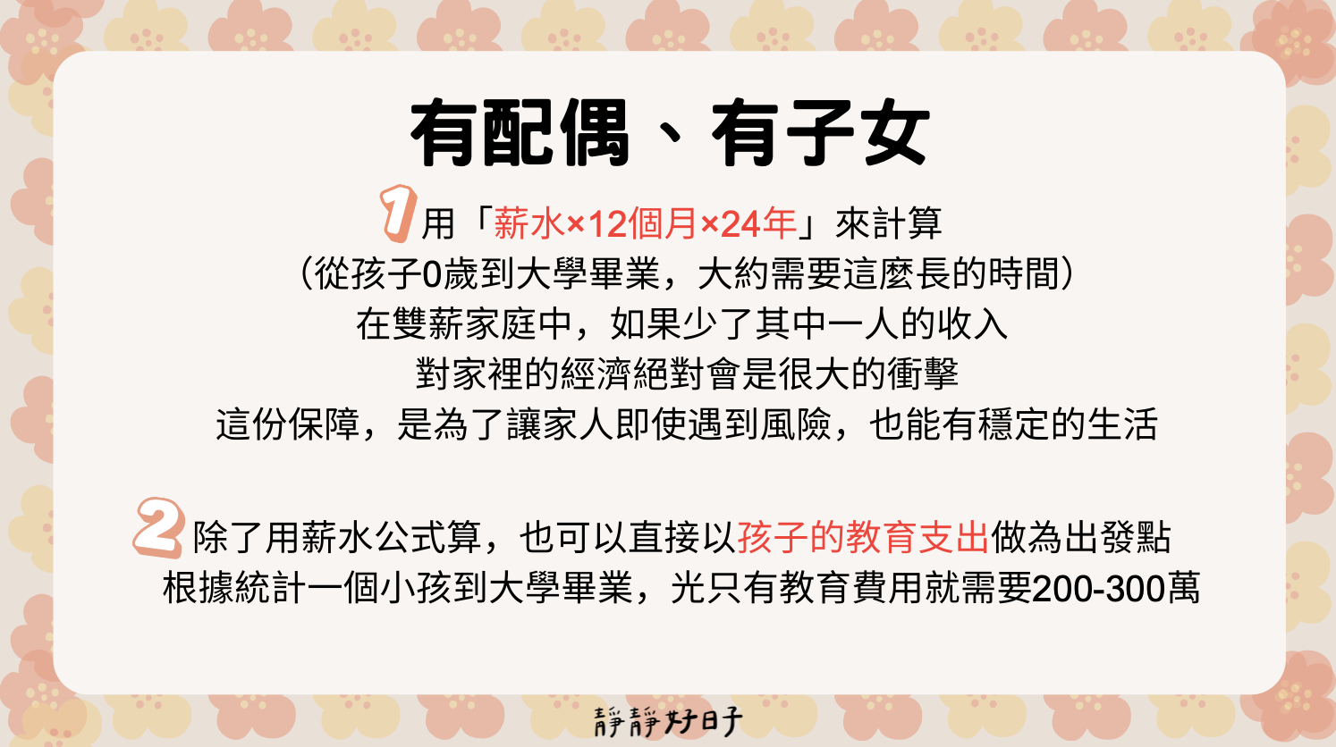 目前有房貸、車貸或為家庭經濟支柱,壽險請務必要規劃,總額度會以房貸、車貸剩餘額度+10年的年收入來計算