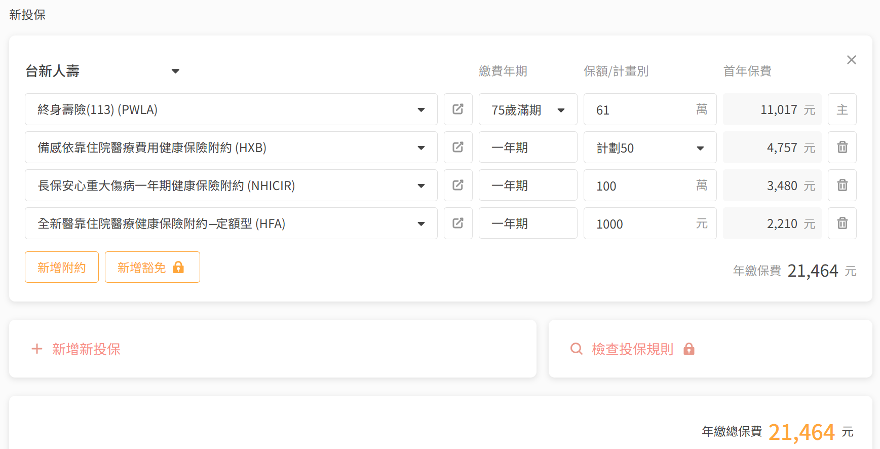 1、台新有投保規則限制,主約61萬只能投保最高計畫40的實支,
