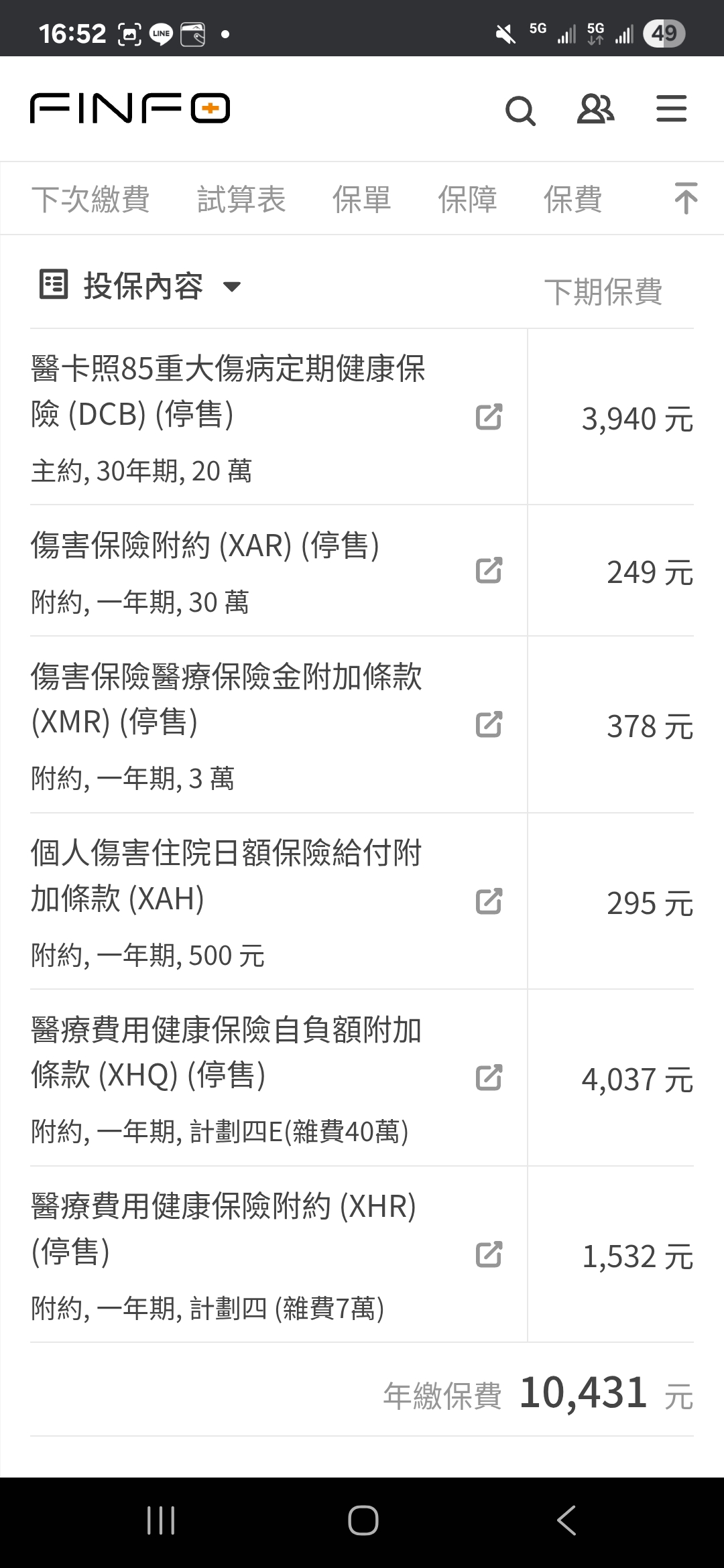 球:重大傷病主約、意外三寶、醫療實支(副本)、自負額實支
