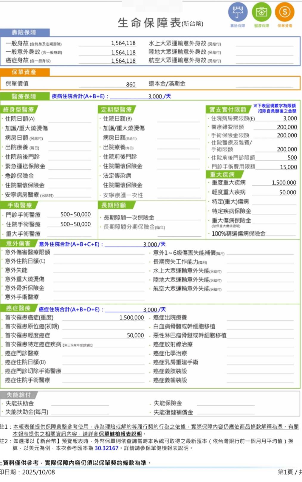 目前看到的都只有主約,建議把附約一併po上來,在檢視上會比較準確喔!!