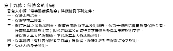 意外實支的部分目前我有一張,為「新光人壽意外傷害醫療保險附約 (L)」,保額為5萬是正本理賠。