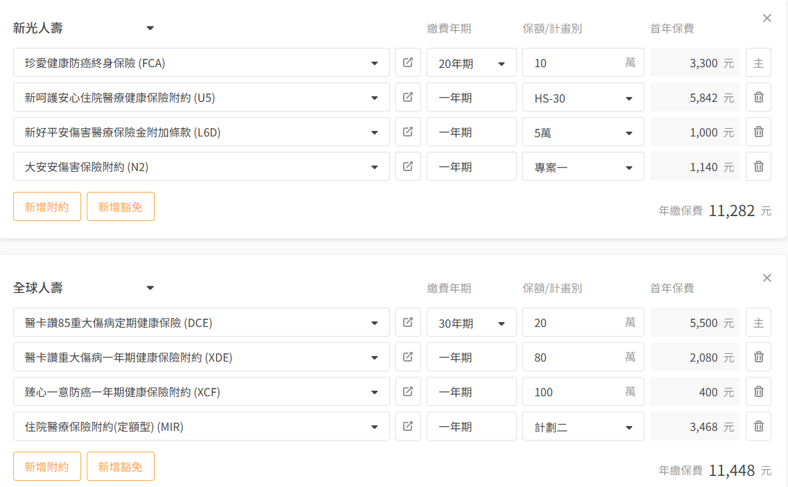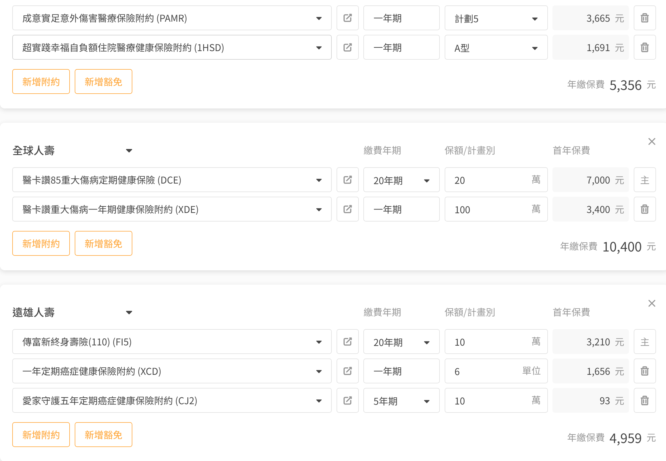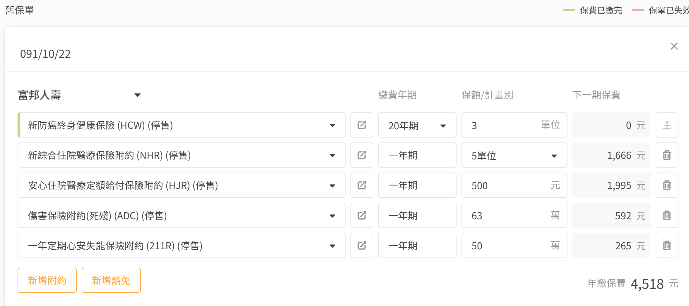 目前擁有的舊保單為富邦以及南山的主約壽險無附約,預計新增南山的意外跟全球重傷以及遠雄癌症一次金,