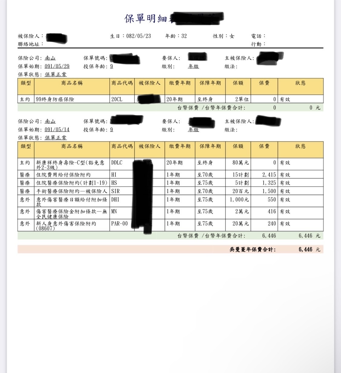 舊保單內容:防癌療程型、失能險、醫療實支、意外三寶、定額醫療、重大傷病、癌症一次金