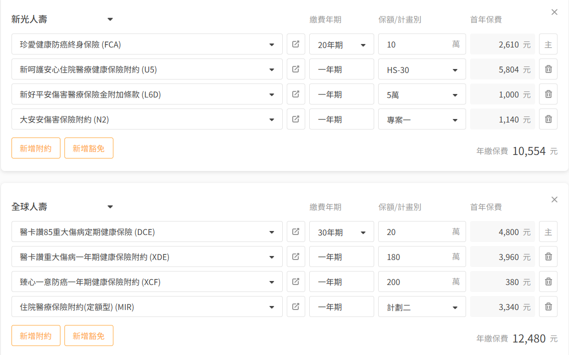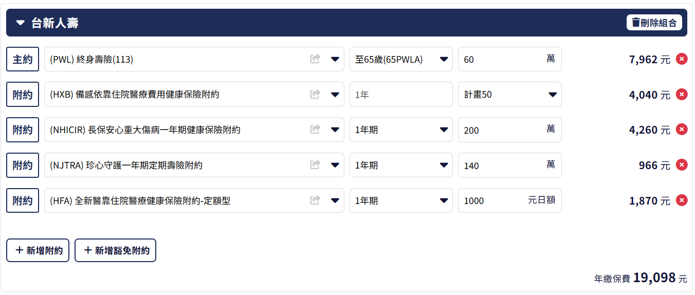 大家好,我目前身上有一份95年中壽的新康泰實支,額度只有可憐的五單位,想說為自己再加強一下醫療上的保障,根據我爬文的資料我覺得台新的實支好像算是不錯的選項,癌症跟意外是遠雄比較好,所以照著爬文的內容試著試算了一下保費,雖然有一點爆預算(大約25000左右),但感覺起來保障應該是還可以的