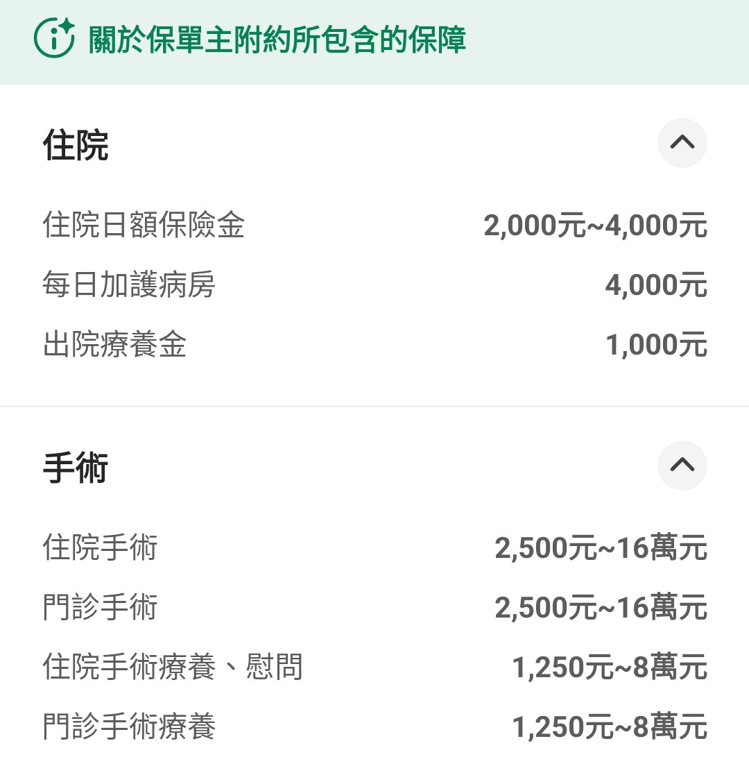 優點:意外實支額度高、醫療實支雜費手術分開、門診手術額度高、特定門診處置