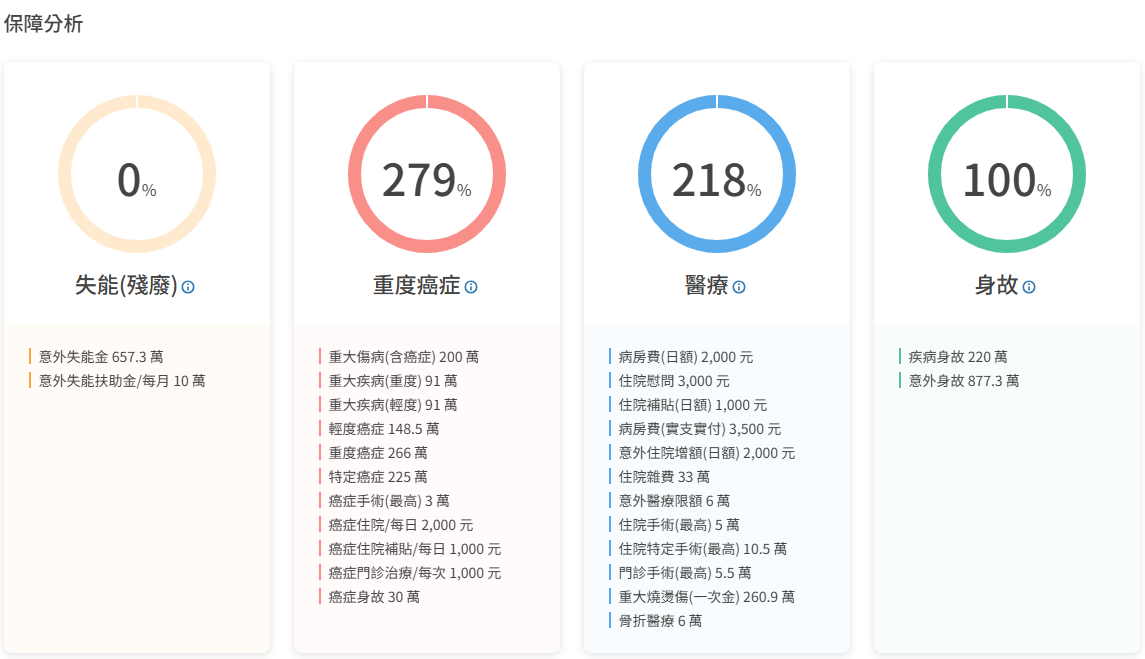 1️⃣ 目前保障缺口:第二家實支實付、重大傷病、癌症險(一次金)、長照險、壽險