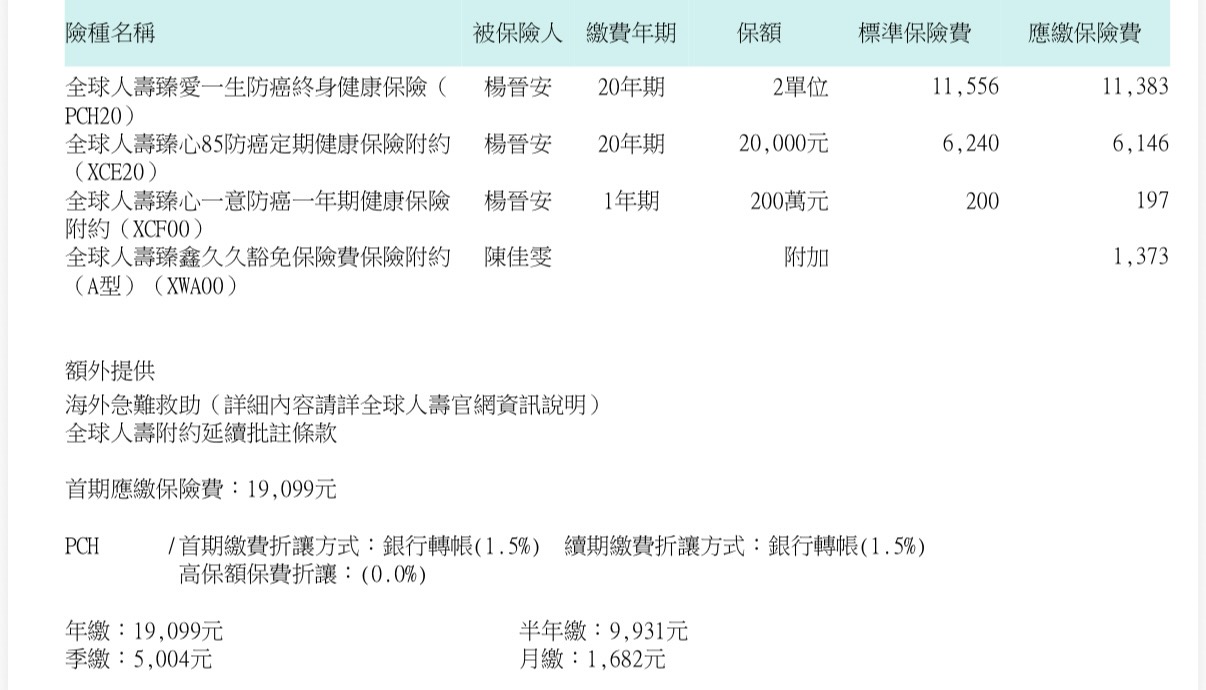 如果你要防癌險可以單看遠雄防癌就好,費率低,理賠定義單純,全球也可以參考。