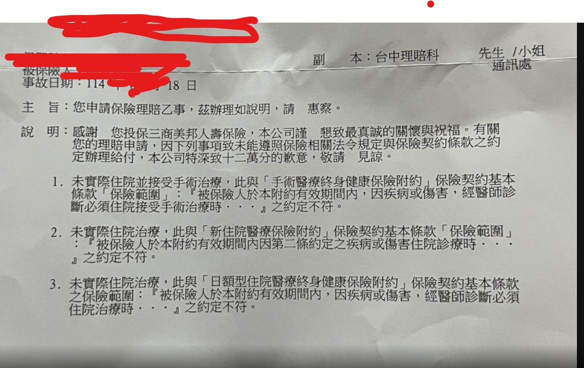 💁🏻♀️ 條款上有載明牙齒手術『須住院』才會理賠,保險公司拿條款說不賠蠻正常的
