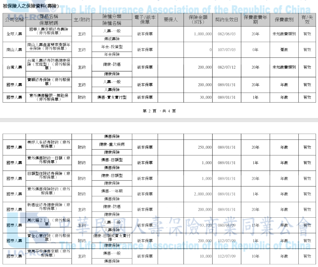 國泰:終身壽險*2、終身防癌(療程型)、終身重大疾病、終身住院日額、醫療實支實付、意外險(含醫療)