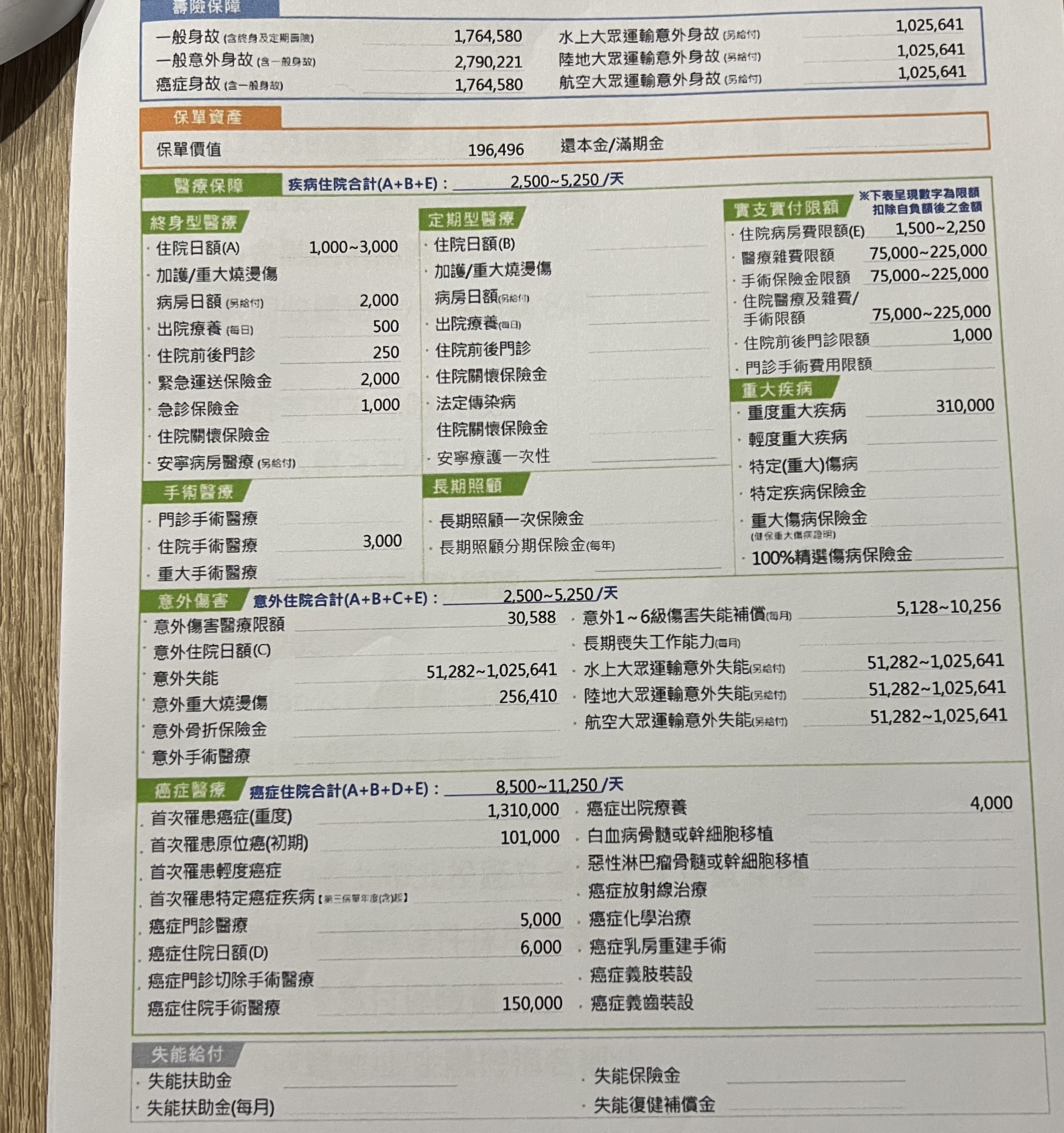 舊保單內容:壽險、終身醫療、意外、醫療實支、癌症療程型