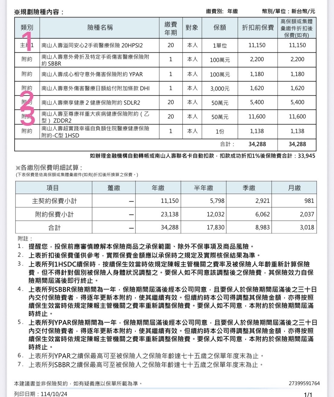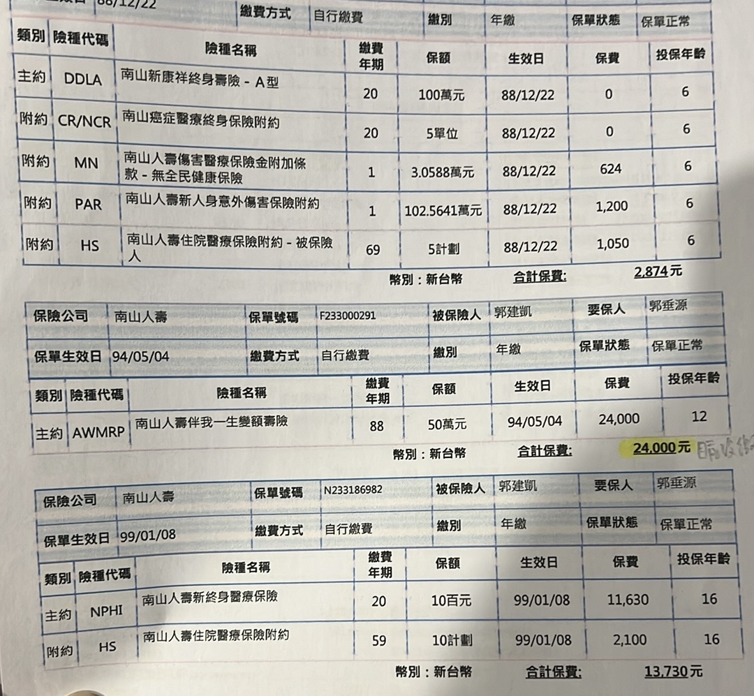 🔺舊保單有:終身壽險*2、終身防癌(療程型)、終身醫療、醫療實支實付*2、意外身故、意外實支實付