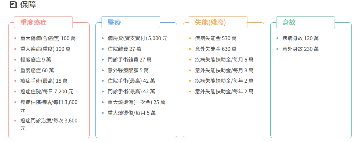 1️⃣ 目前保障範圍:雙實支、重大傷病、癌症險(一次金)、意外險、終身失能,保障相當不錯