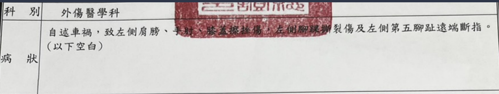 醫療費用的部分請跟對肇強制險以及富邦可申請意外實支理賠,失能的判斷基本上依據判定說明上沒有列舉到第五指部位。