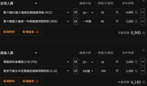 綜上所述,目前首次投保且有預算考量下,建議優先參考富邦/新光+全球+遠雄的規劃,條款完善且後期保費漲幅較平穩;預算可以再提高的話,遠雄的癌症一次金RQ1跟療程型XCD建議一併加上,加強保障額度喔