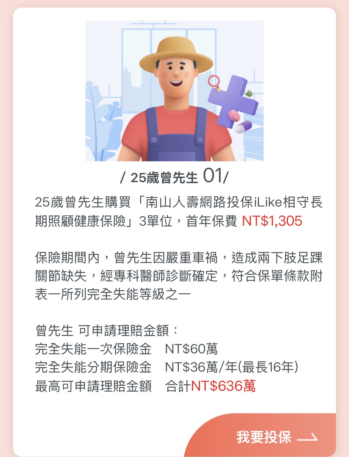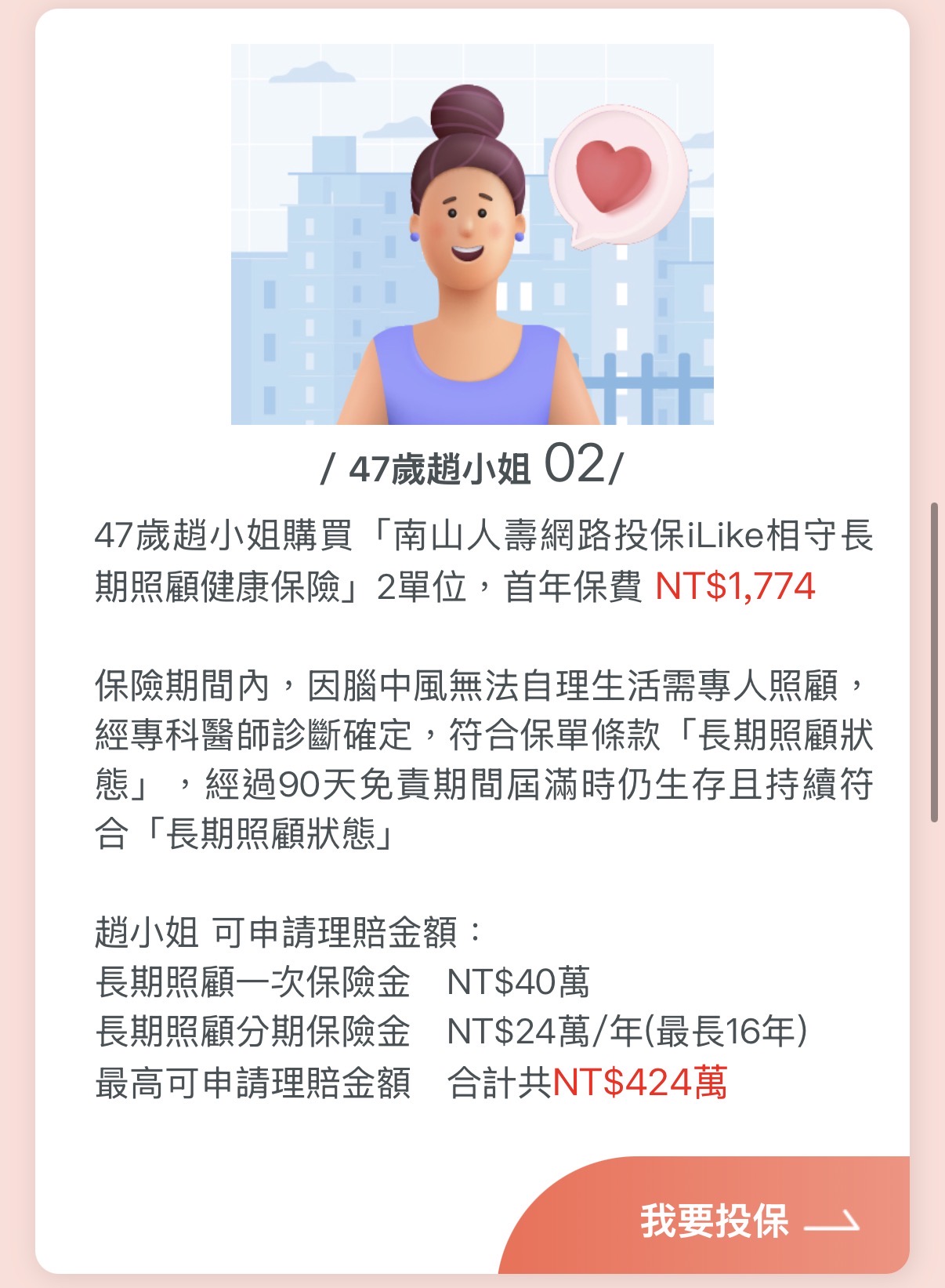 Q:那如果未來發生申請長照的理賠,保險公司隔年還會續保嗎? 不保證續保的風險上,能夠像南山網站的案例說明理賠到百萬?