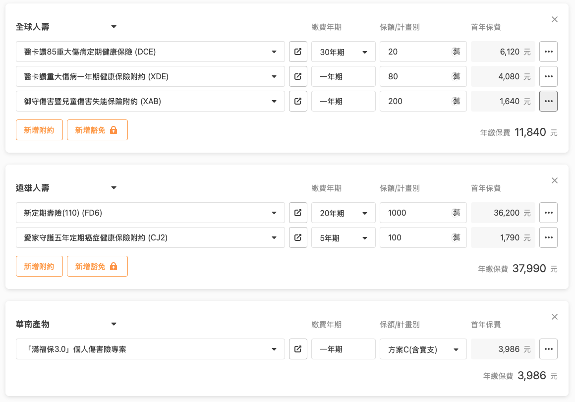 另上述也有提及可額外增加壽險意外險的部分,建議也可以一起規劃在新光(若打算規劃在新光,全球的意外死殘即可先刪除)