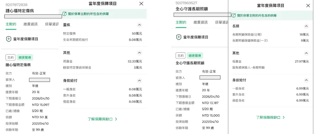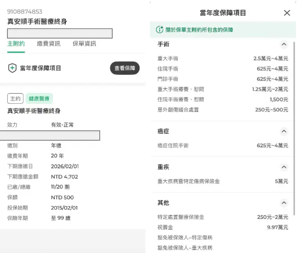 🔺舊保單有:終身手術、終身醫療、終身特定傷病、終身長照、終身防癌(療程型)、住院日額、醫療實支實付、意外險(含醫療)、骨折險