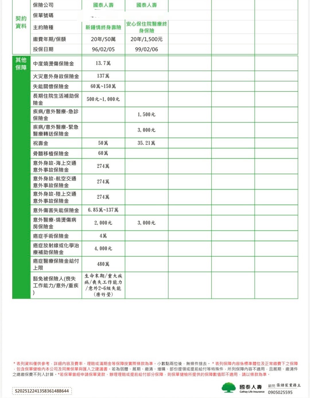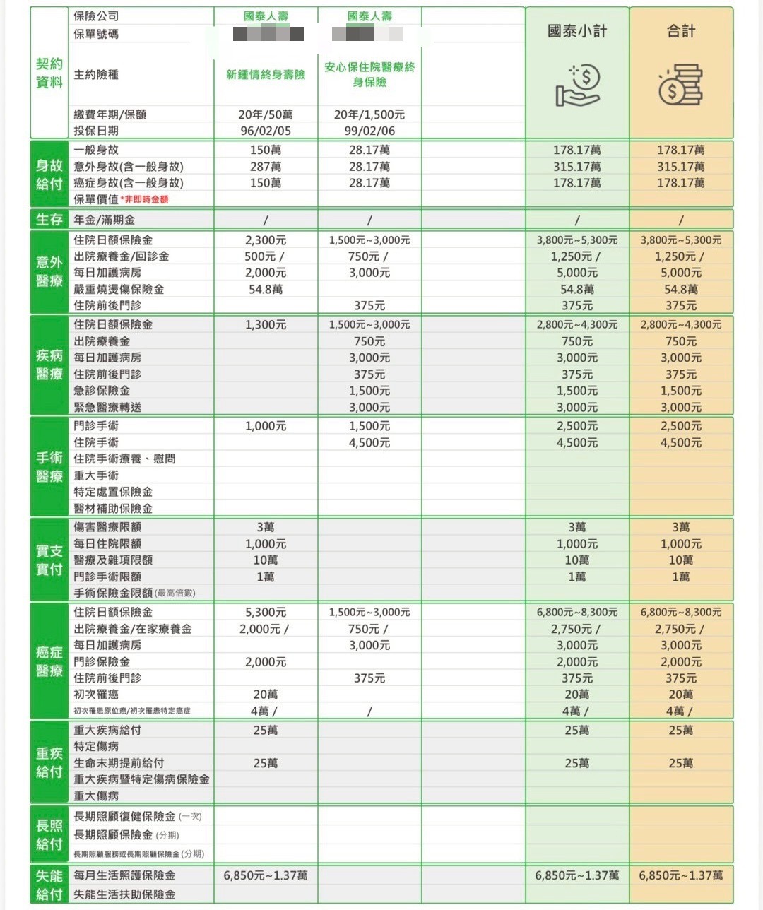 綜上所述,國泰舊保單的終身險繳費年期只剩下2年跟4年,預算允許下建議繳完,就擁有基本的保障了