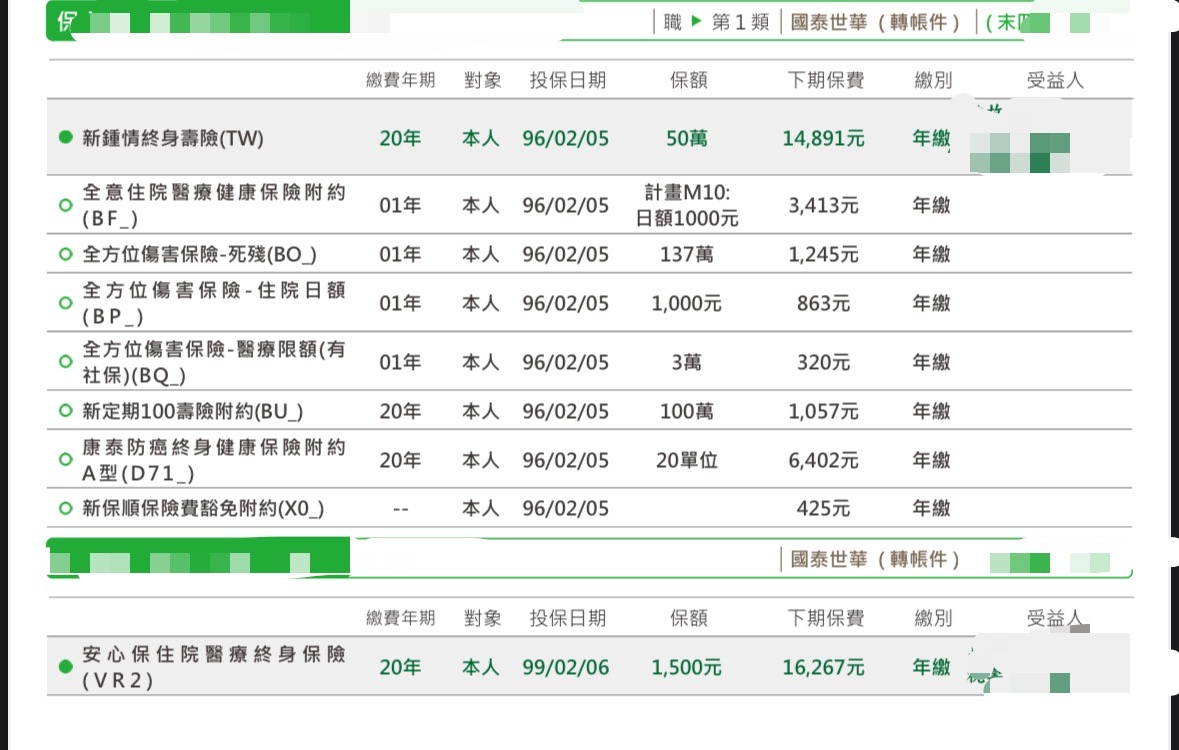🔺舊保單有:終身壽險、終身防癌(療程型)、終身醫療、定期壽險、醫療實支實付、意外險(含醫療)