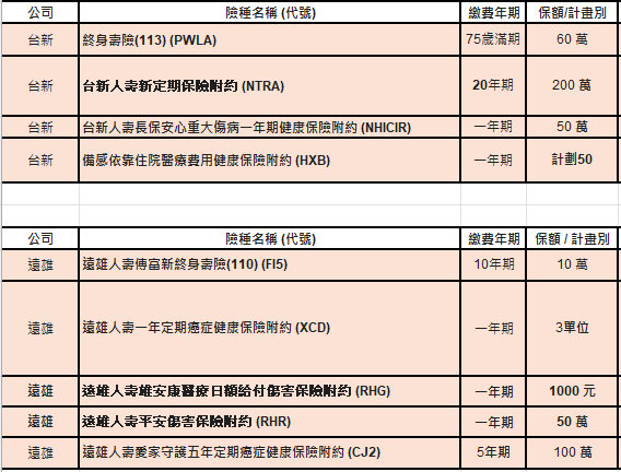 🔺舊保單有:終身醫療、終身&定期手術、定期壽險、長照險、醫療實支實付、意外險(含醫療)、骨折險、重大傷病、癌症一次金