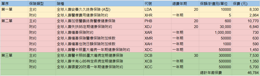終身+定期失能險、醫療險(實支實付/終身日額)、意外險(實支實付/日額/身故)、重大傷病險*2、特定疾病險、癌症險。