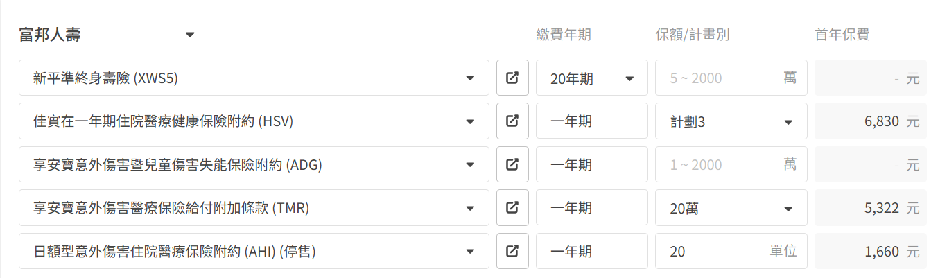 目前意外險(含醫療)建議可以優先參考富邦、遠雄的規劃,意外實支額度可以規劃較高喔