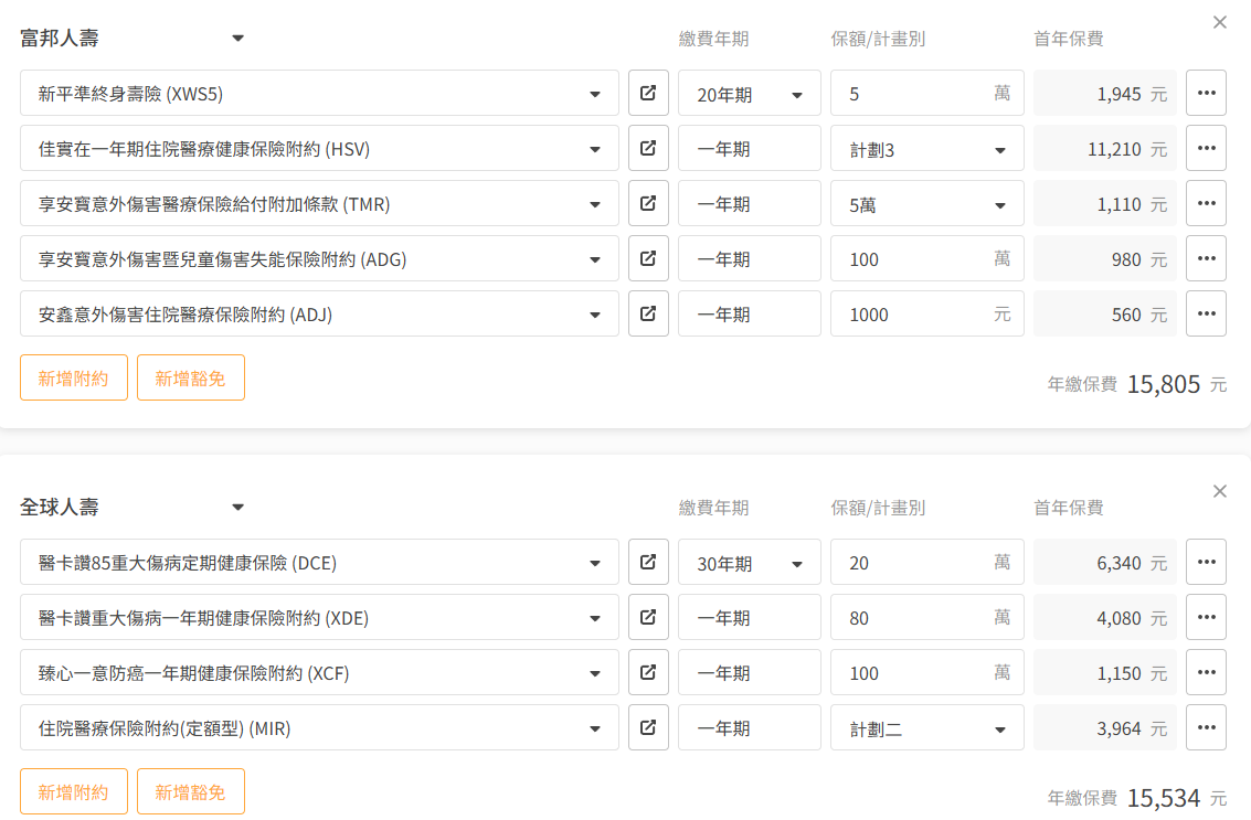 📎 點我看完整方案範例 →37歲男生 | 新光 & 全球 組合方案