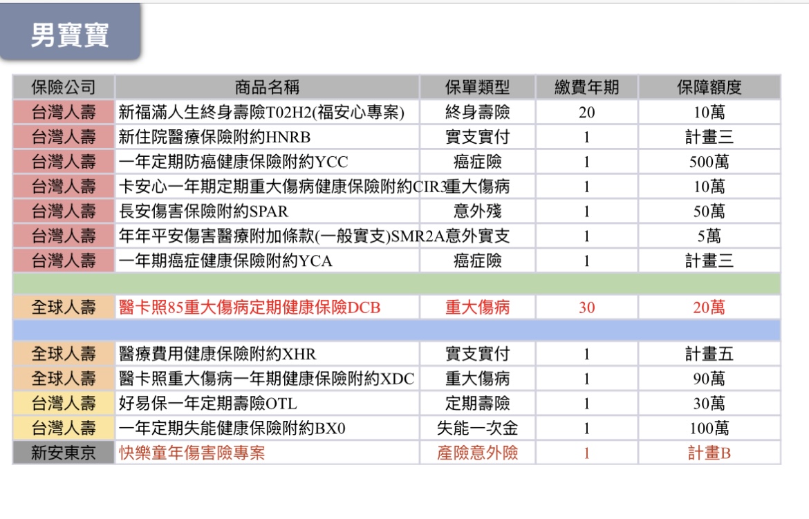 舊:台壽重傷CIR3保額10萬+全球重傷保額110萬,有規劃到基本保額了,若想加強可以參考全球的重傷附約、其他保險公司的方案