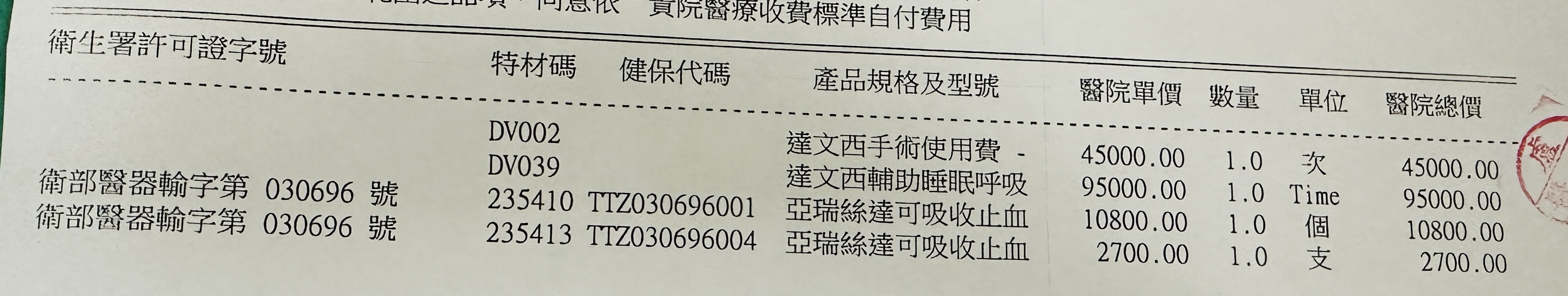 想詢問的是以上兩張保險是否可理賠「達文西手術」、「亞瑞絲達可吸收止血」(如圖)