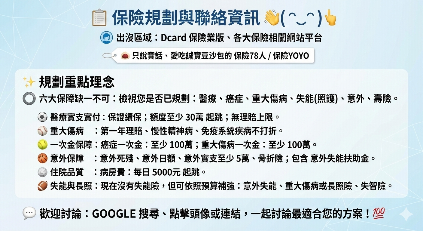 在協助你規劃之前,先請問以下幾個關鍵問題,有助於確認投保條件與方向: