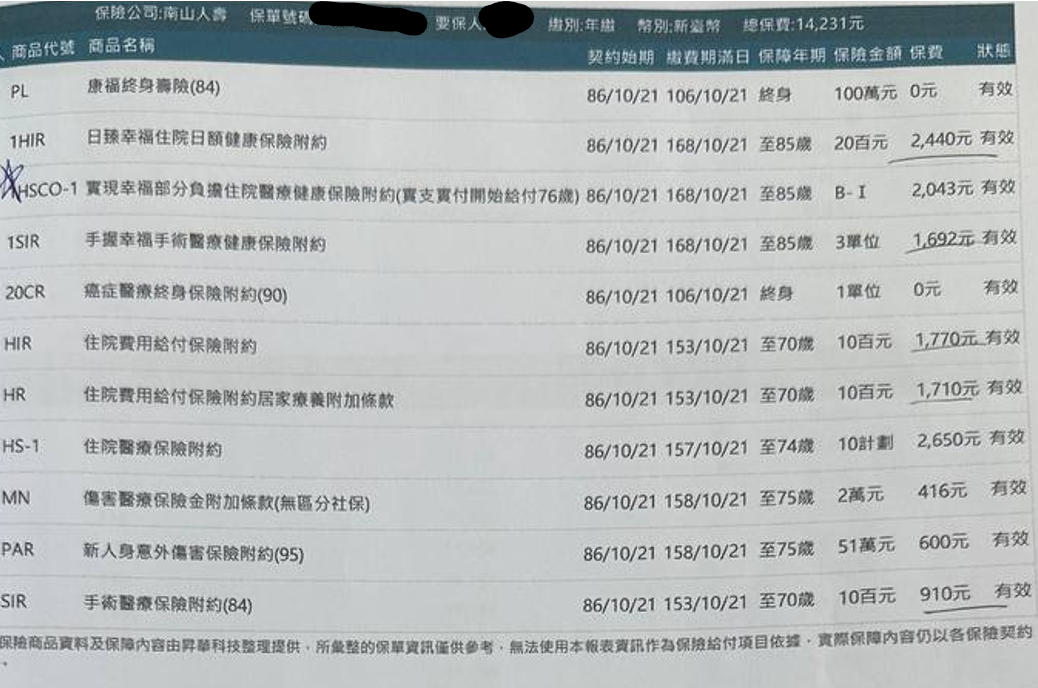 🔺舊保單有:終身壽險、終身防癌(療程型)、住院日額*2、手術險、醫療實支實付*2(含76歲啟動)、意外身故、意外實支實付