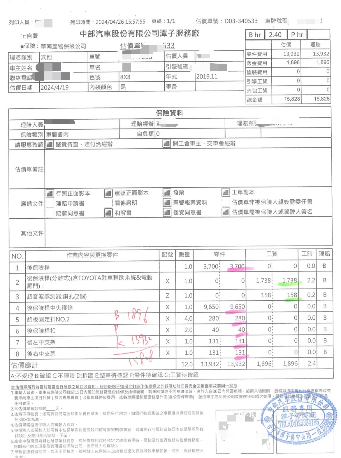 我前年2024撞到別人的車,他是華南保險,我只有強制險,所以我都是自己去對他的保險公司,我收到保險公司給我的估價單總金額是15828(如照片)他是2019年的車,想請問我需要全額賠15828嗎?還是賠折舊後的金額?