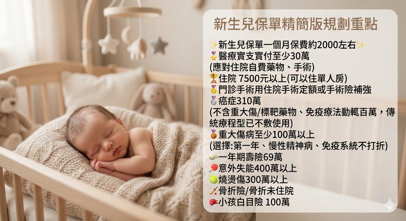 女寶寶於01/08出生,想要規劃保險,預算約2-3萬,希望能涵蓋醫療、意外、癌症、重大傷病。請推薦保險組合,謝謝🙏
