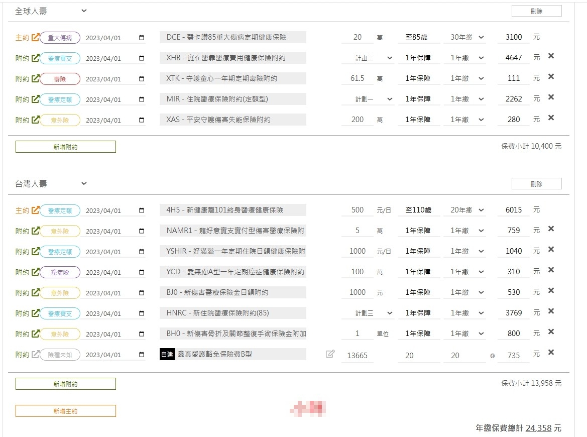 目前建議補強的保障有:重大傷病(提高額度)、癌症一次金(提高額度)、第二家意外實支實付(提高額度)及壽險(家庭責任)