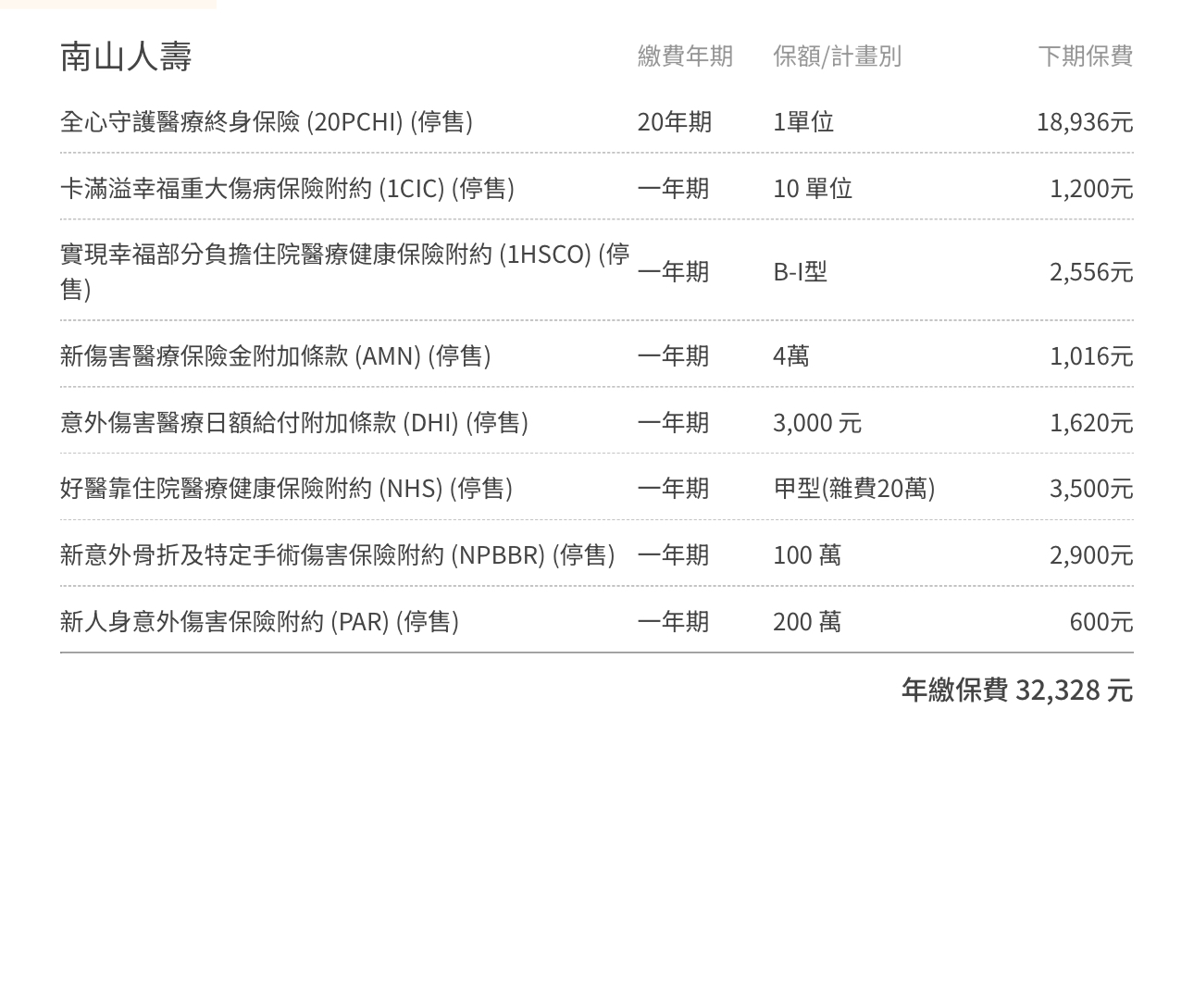 1.南山:住院日額/手術(定額)、重大傷病、實支實付、意外險(含意外醫療)