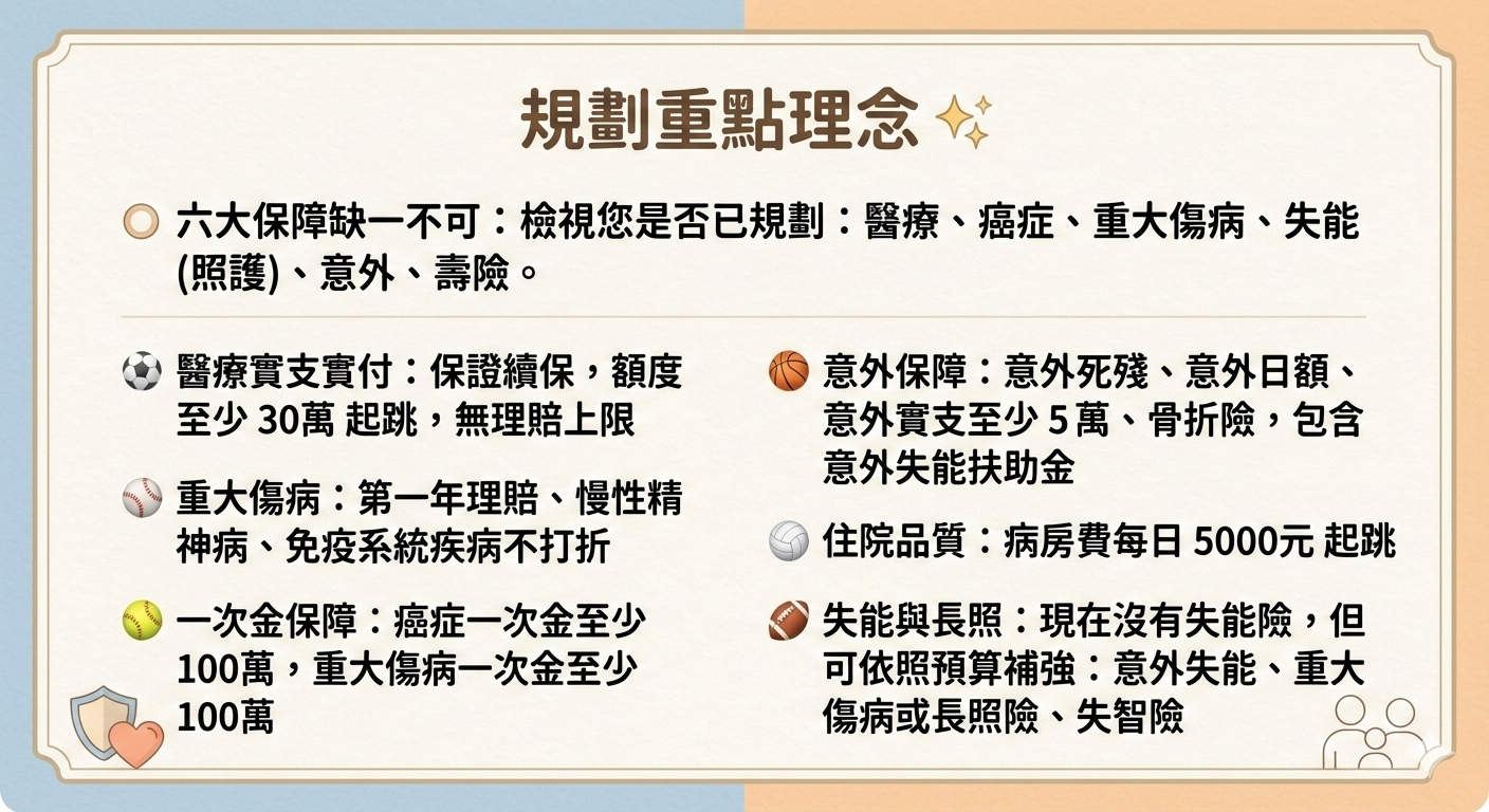 以下是我協助客戶規劃時的 5 大核心保障重點: