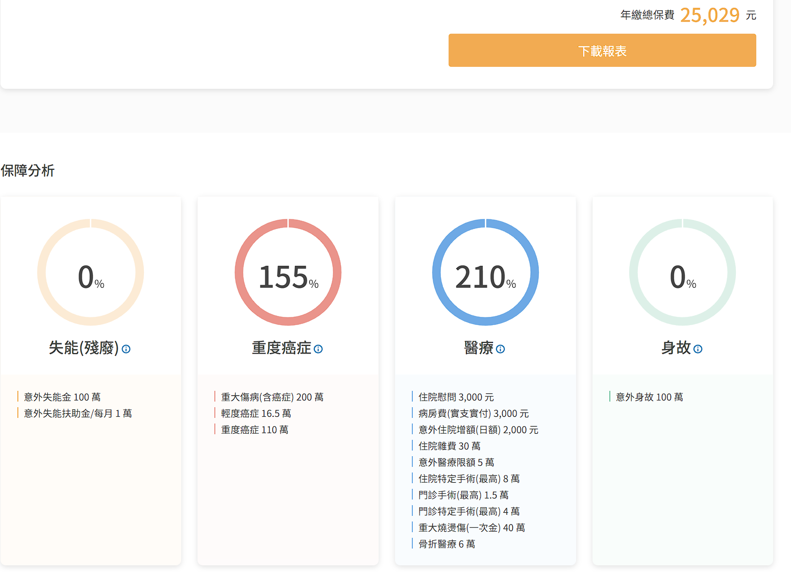 2. 重點保障: 實支實付(希望能涵蓋門診手術雜費)、重大傷病(一次金100 萬以上)、意外險。