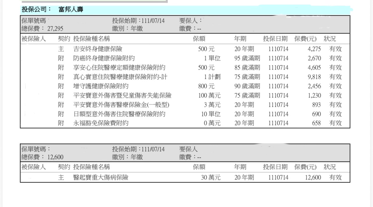 去年開始有開始重視自己的保單,也有詢問過多家保險公司是否能加強自己的保單內容: