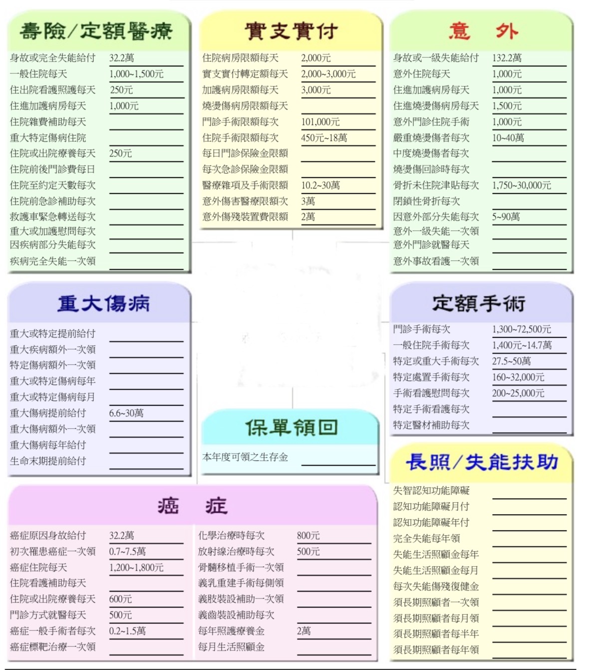 ⭕ 六大保障 : 醫療、癌症、重大傷病、失能(照護)、意外、壽險